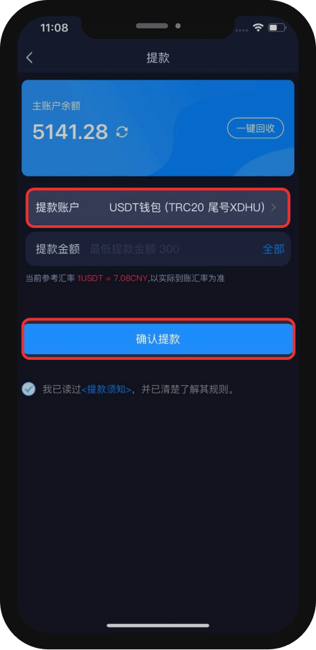 3、地址绑定成功,进入UED提款页面,选择您绑定的USDT地址进行提款即可。